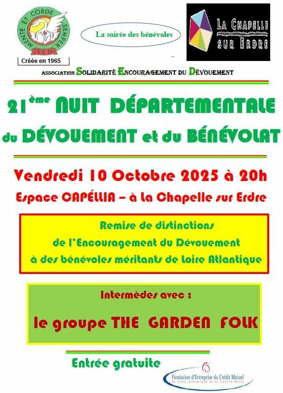 Comme tous les ans, la S.E.D. organise la nuit départementale du dévouement et du bénévolat. Cette année, en 2025, elle aura lieu le 10 octobre à 20h, salle Cappellia à La Chapelle-sur-Erdre
